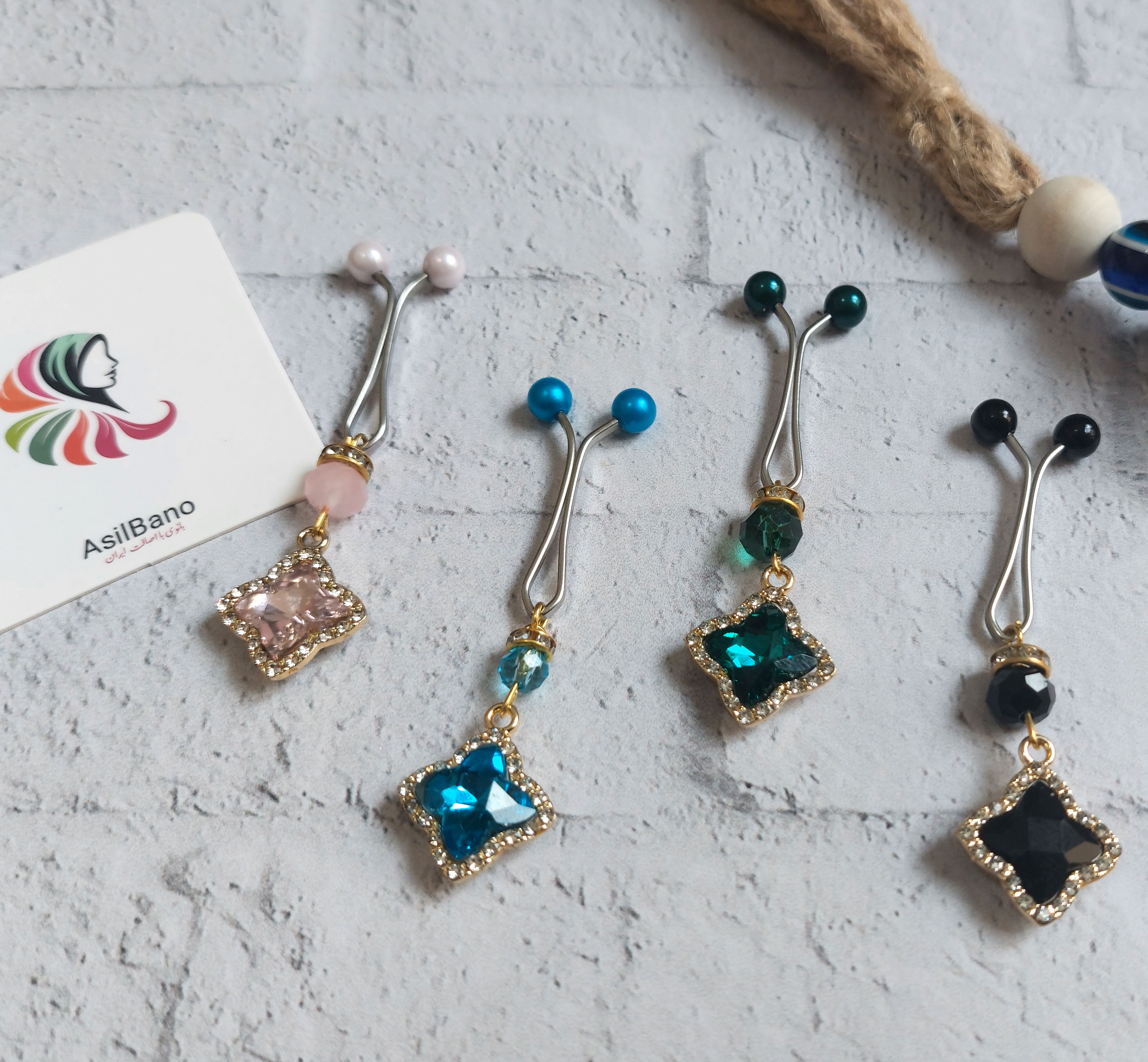 گیره روسری اصیل بانو با آویز جواهر نگین دار ایستایی دارد و روسری را محکم نگه می دارد و در حین حال با روسری مهربان است و آن را نخ کش نمی کند.
