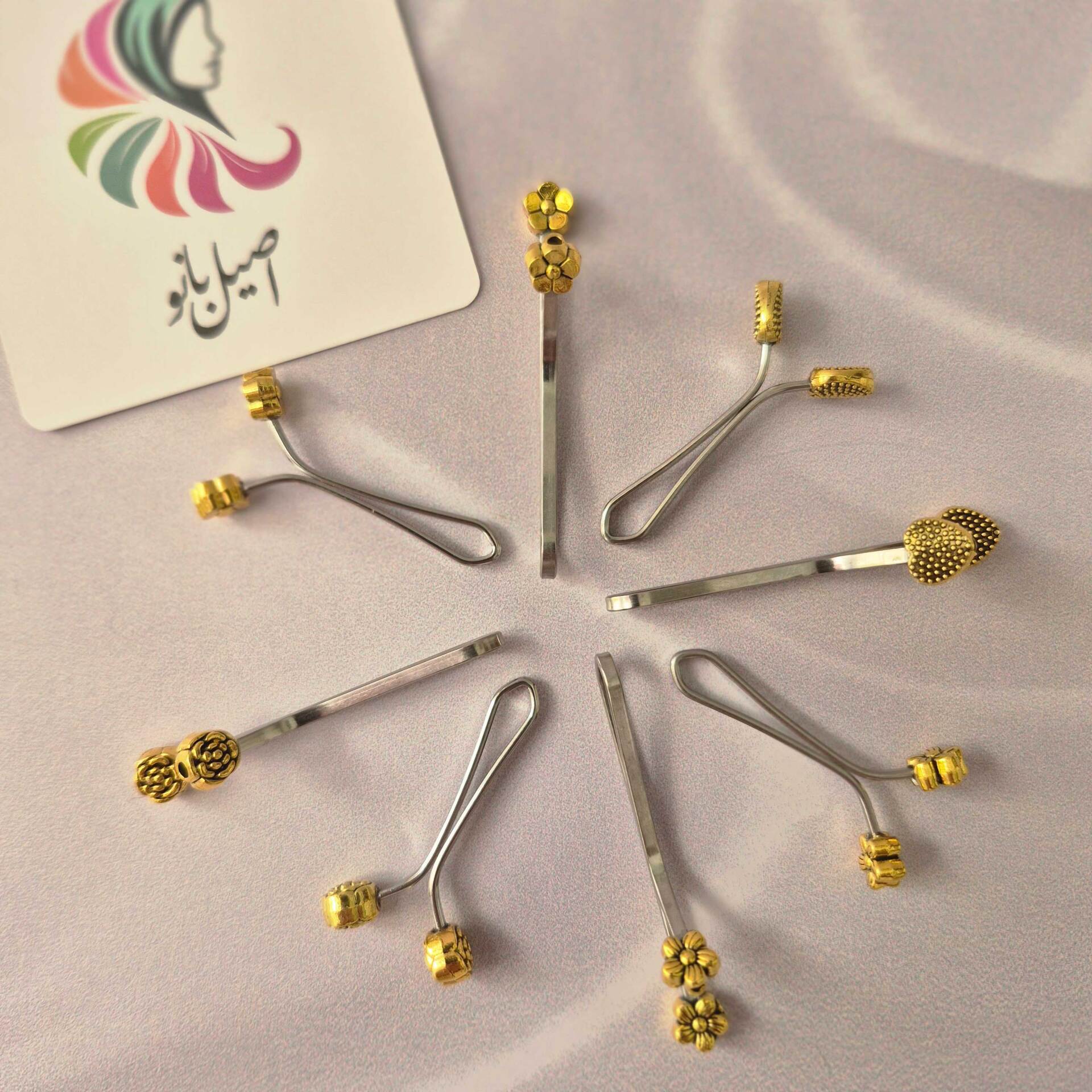 گیره روسری لبنانی اصیل بانو با سر مهره فلزی طرح دار (12 عددی)